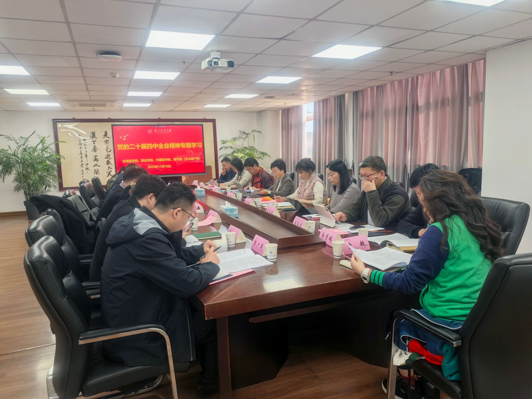 11月18日下午,动物医学院、草业学院、外国语学院与图书馆(文化遗产部)联合开展党的二十届四中全会精神党委理论学习中心组专题学习联学活动。校党委常委、副校长朱艳,相关单位班子成员出席会议,本次学习由外国语学院党委书记董红梅主持。集中领学环节,图书馆(文化遗产部)党总支书记张炜、草业学院党委书记戴廷波、动物医学院党委副书记姚敏磊分别领学了《中共中央关于制定国民经济和社会发展第十五个五年规划的建议》。...