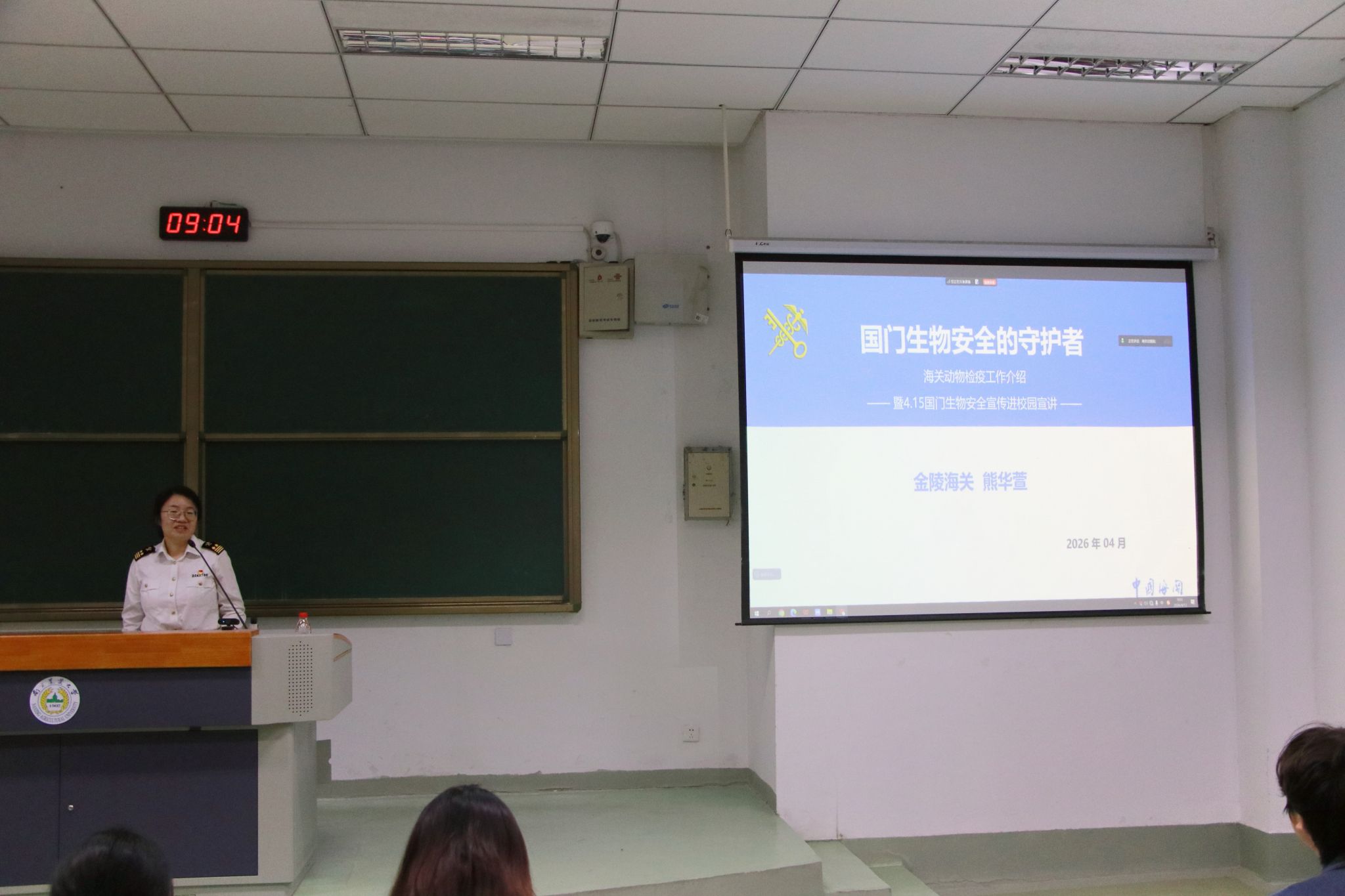 金陵海关熊华萱女士以“国门安全的守护者-海关动物检疫工作介绍”为题,结合一线检疫案例,生动讲解了海关动物检疫的历史沿革、工作流程、核心职责,彰显了国门生物安全守护的重要意义,让在场师生深刻认识到国门生物安全与每个人的生活息息相关,对海关检疫工作的严谨性和重要性有了更直观的了解。