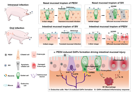 在肠道黏膜中,研究揭示了PEDV更为独特的致病机制。PEDV可通过激活黏膜下神经元的乙酰胆碱-CHRM3信号通路,诱导杯状细胞形成 GAP(Goblet Cell–Associated Antigen Passage)通道。这一本用于递送食物抗原、维持免疫耐受的生理通道在PEDV感染后出现“用途转移”——即便肠道上皮结构仍完整,肠道细菌也可通过GAP进入固有层,引发炎症反应,从而加剧肠道损伤并促进病毒扩增。值得注意的是,阻断CHRM3信号可显著抑制GAP形成,感染仔猪的腹泻、体重下降和组织病变均明显减轻,证明GAP在PEDV高致病性中的关键作用。