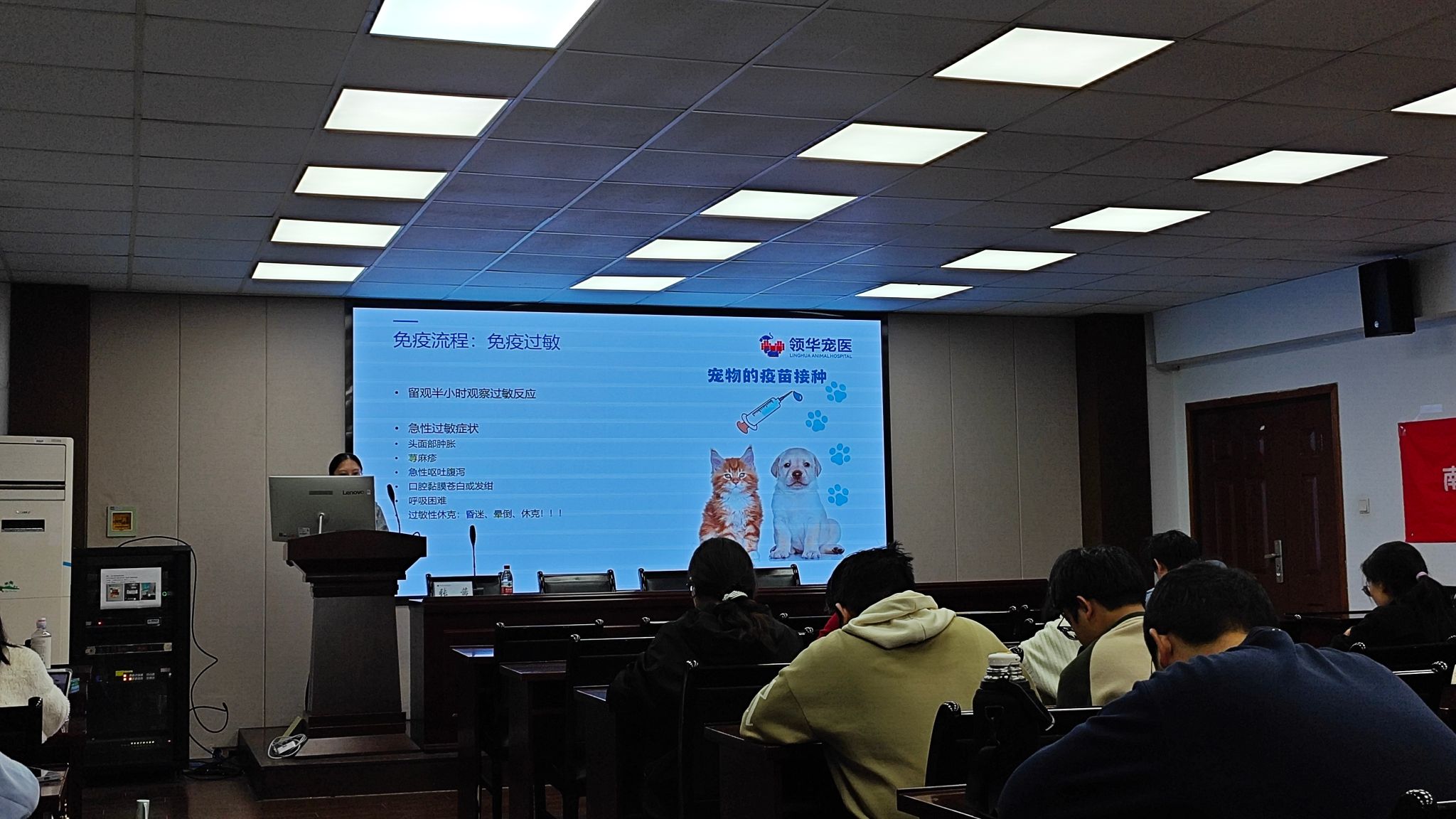 张茜医生深耕宠物预防保健领域,拥有丰富的门诊、住院与化验室工作经验。课堂上,她以临床实操为导向,系统讲解免疫流程、规范驱虫、预防体检三大关键模块,详细介绍犬猫常用疫苗种类、首免与加强免疫程序、抗体检测标准及过敏应对措施。